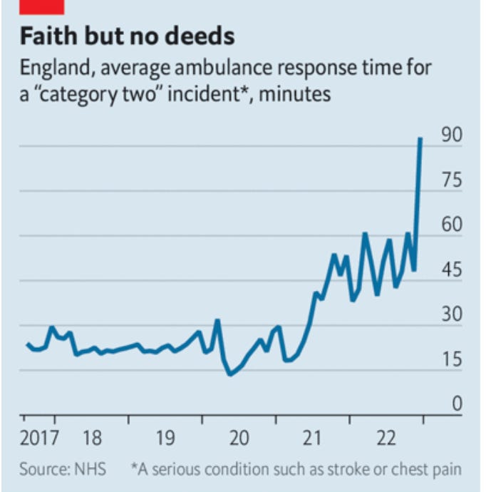 Yikes. Don’t have an emergency in England. And the graph’s little footnote is priceless: “A serious condition such as STROKE or CHEST PAIN.” It’s almost like they are trolling us.