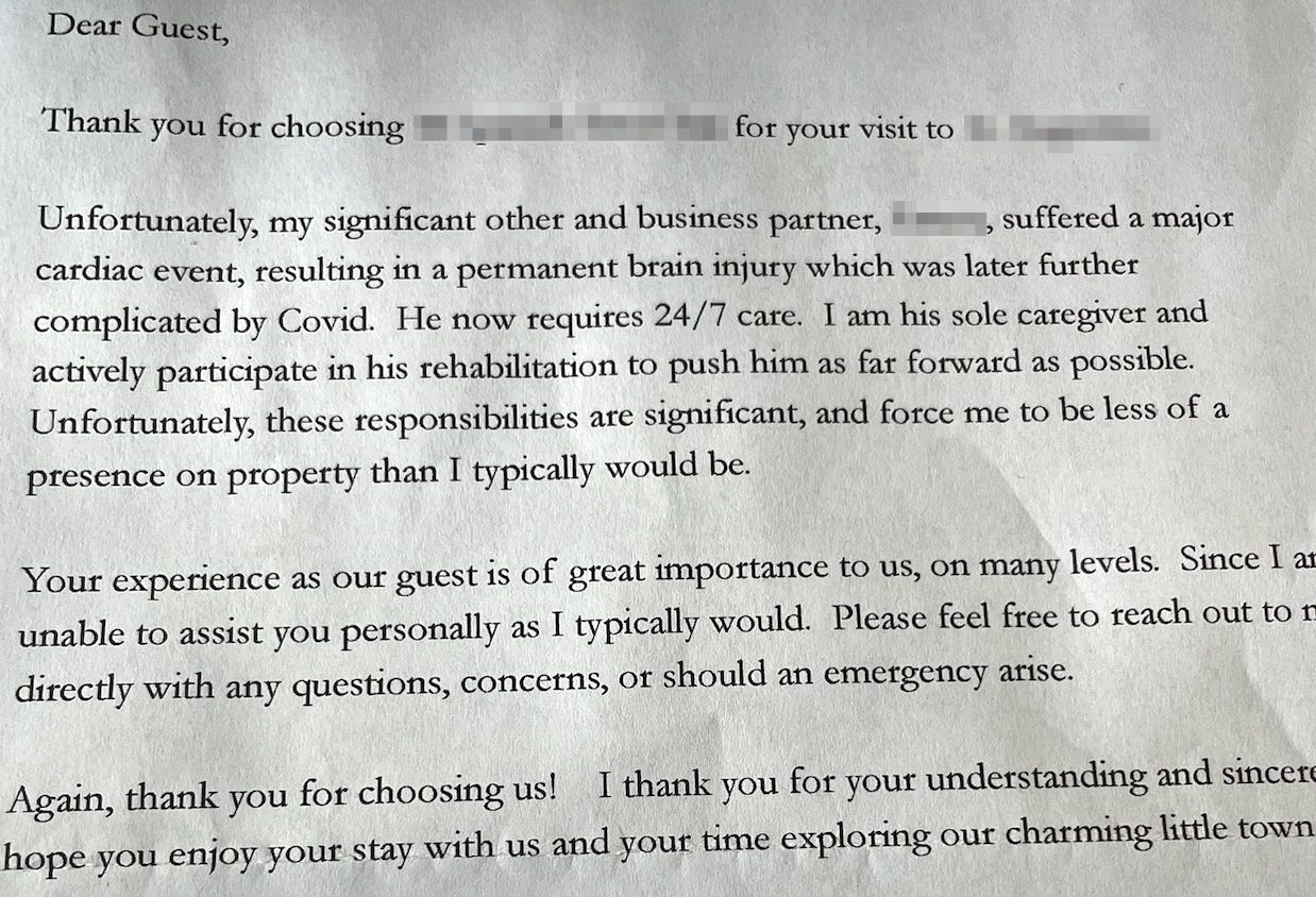 After browsing around the well-groomed back terrace and the romantic garden, and after using the quaint key to return to the room, we began looking over a nice folder containing all the various paperwork, information, additional rules and local points of interest. Then I saw Michelle intently reading a paper that looked like a letter, and I could tell she had oddly stiff body language. When she finished, she handed it to me without saying a word.