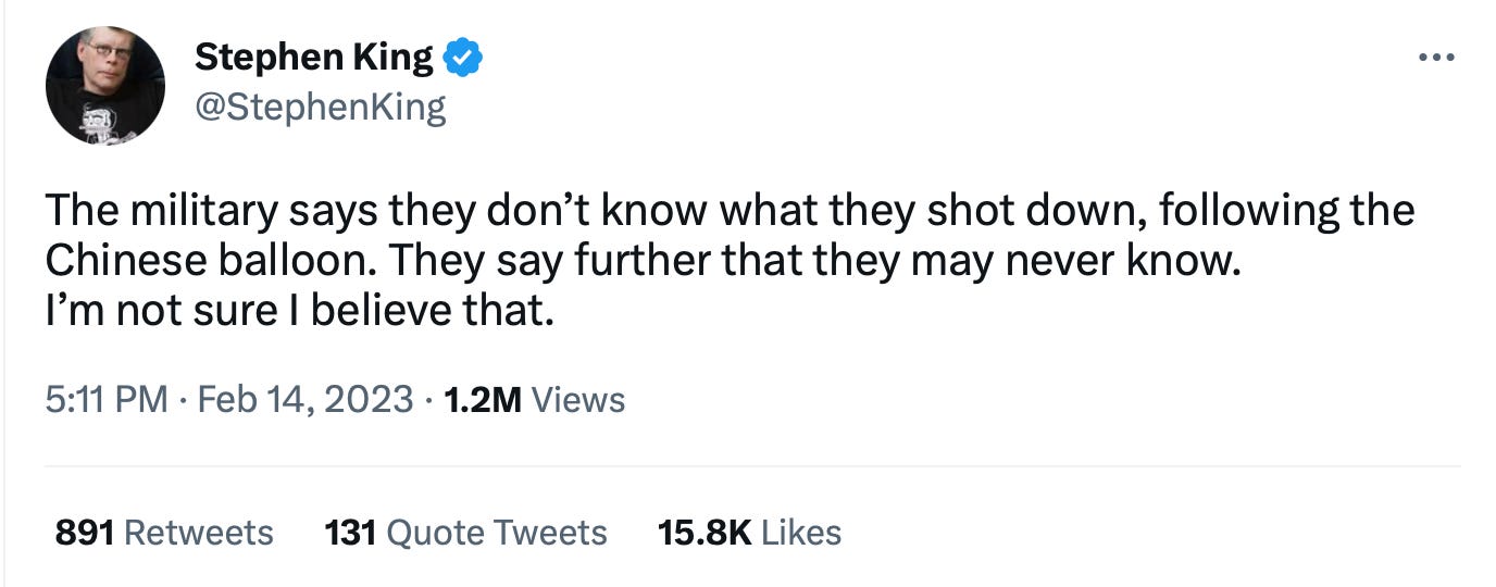 Yesterday, another influencer joined the ranks of the awakening. This time it was Stephen King. He’s tentatively questioning the government’s sketchy balloon narrative. Not directly. Not accusingly. He’s just “not sure.”
