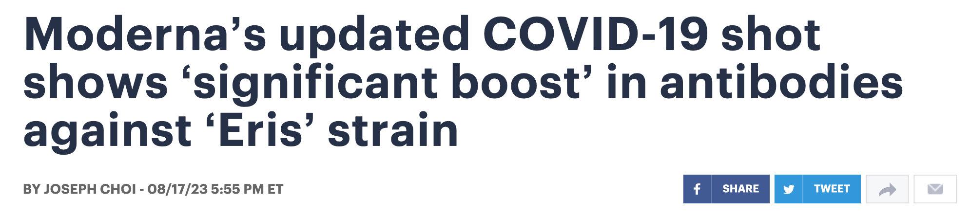 The second story breaking this week was the FDA’s torrid preparations to fast-track approval of Moderna’s new annual mRNA covid booster shot, which coincidentally and propitiously turned out to be specially designed for the super-duper transmissible Eris variant. From the Hill on Thursday:
