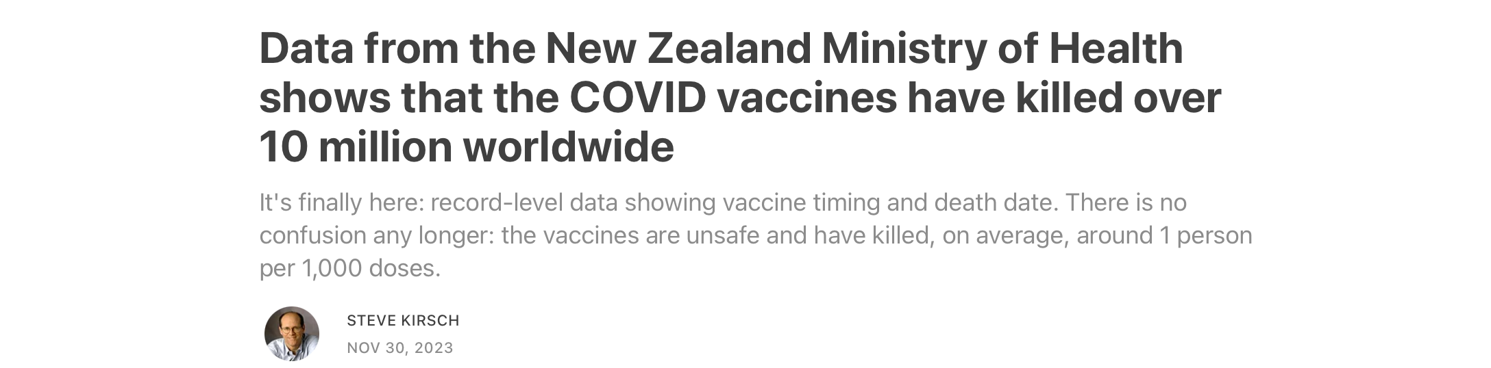 Around the same time the “probe” story broke, Steve Kirsch published a Substack and a fusillade of tweets, in which he claimed to have insider whistleblower data from New Zealand that conclusively established causation for the mRNA shots: