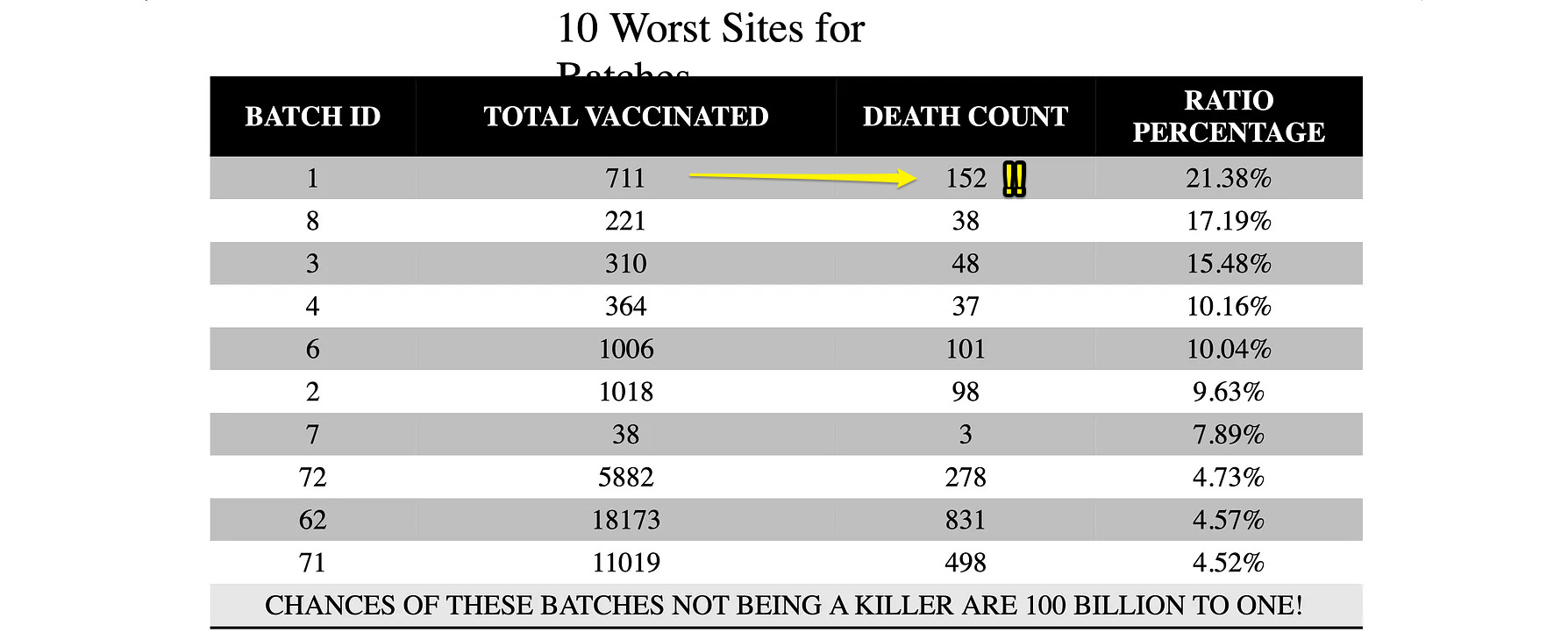 In fairness, Professor Fenton was doubtful about some of the wilder claims, cautiously suggesting a variety of commonsense alternative possibilities that could explain things like the high-mortality “hot lot” data shown in the table above. For example, the 22%-deadly batch might have been given to a bunch of frail nursing home residents in a single facility, especially considering the low total batch numbers. A fair point.