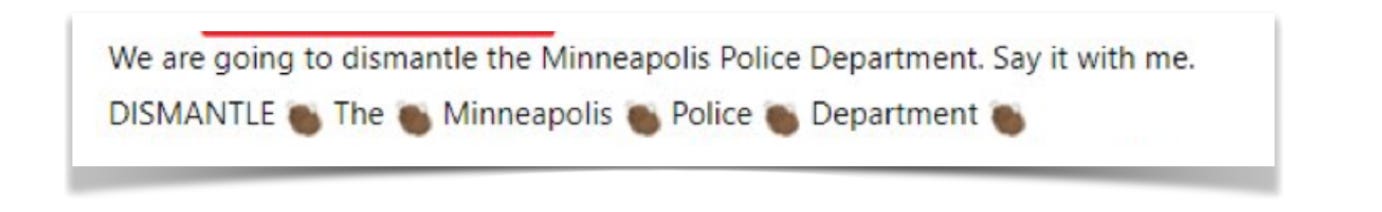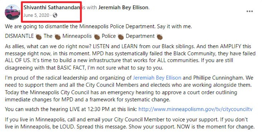 Chairwoman Shivanthi’s June, 2020 Facebook post will give you an idea of her previous point of view. She didn’t just want to “dismantle” the police department. She wanted to dismantle the police department in ALL CAPS, with clapping between each word: