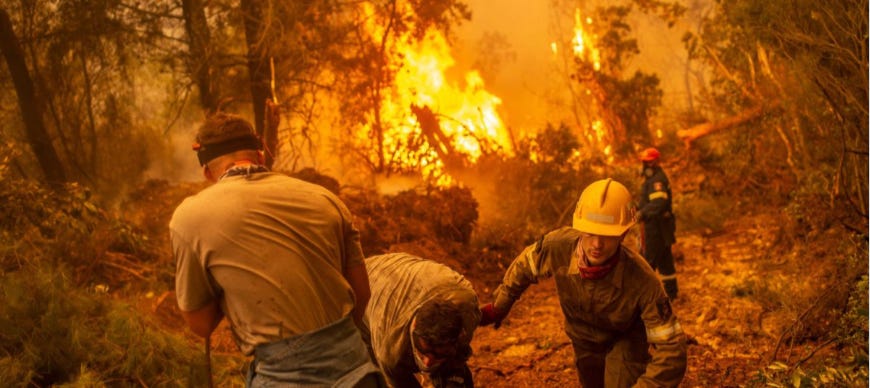 🔥 The UK Guardian ran a narrative-snarling story yesterday headlined, “Most fires in Greece were started ‘by human hand’, government says.” Oops. The sub-headline explained, “Official blames arsonists for the majority of 667 blazes that have spread in the extreme weather.”