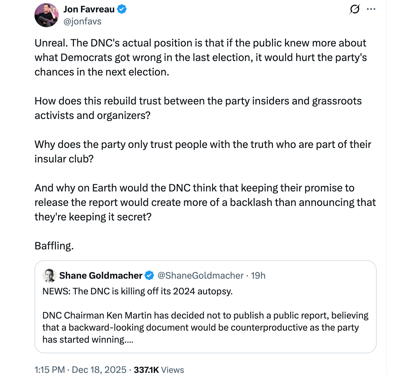 🔥 It was pretty rich. This win-at-all-costs mindset is the same kind of anti-democratic nonsense that got the Democrats into this mess in the first place. Shut up and let the party elites decide what you need to know. Had they run a competitive mini-primary in the summer of 2024, instead of just selecting Kamala, they might have found a stronger candidate.