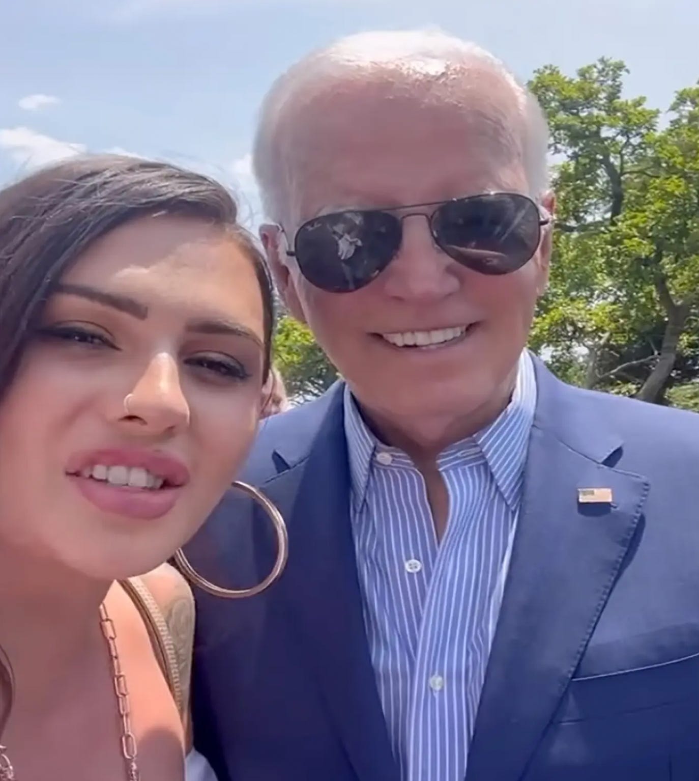 Mere moments before this indescribably embarrassing photo was taken, the man covering his artificial breasts in the picture above, so-called “trans influencer” Rose Montoya, 27, shook hands with Joe Biden, who some people believe is the President of the United States. Here they are: