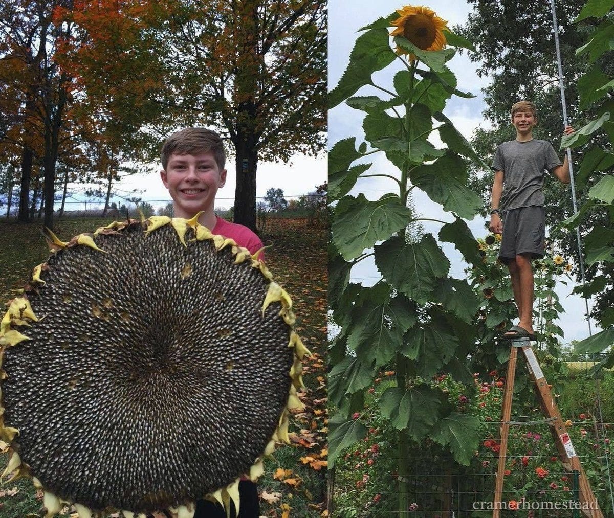 🔥 This industrious young man grows sunflowers, and according to his Instagram post, every year he diligently saved the seeds from his biggest plants, until he finally grew this monster flower: