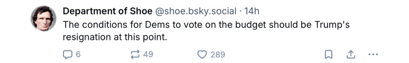 The Times reported that in response, Senator Schumer “swiftly rebuked the White House” (oh, no) and called the threat of new layoffs “an attempt at intimidation.” Remember those words. I’m betting the Democrats fold, even though BlueSkiers are furiously demanding they call Trump’s bluff: