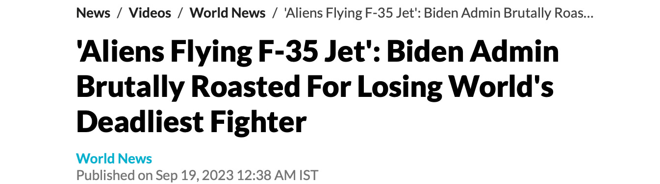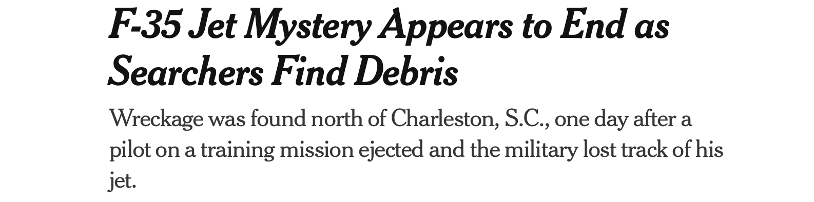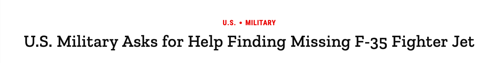 F35 fighter jets are arguably our highest-tech weapons. They cost $135,000,000 in pre-pandemic dollars, according to GAO figures. So losing one is like a thousand million teenagers losing their retainers. The F35 program has cost taxpayers $1.7 TRILLION DOLLARS so far.