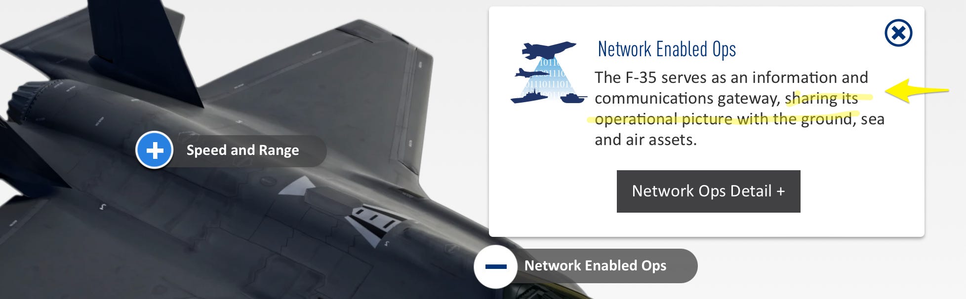 According to manufacturer Lockheed Martin’s promo website, F35.com, the F35 is not just a stealth fighter. It’s a communications gateway: