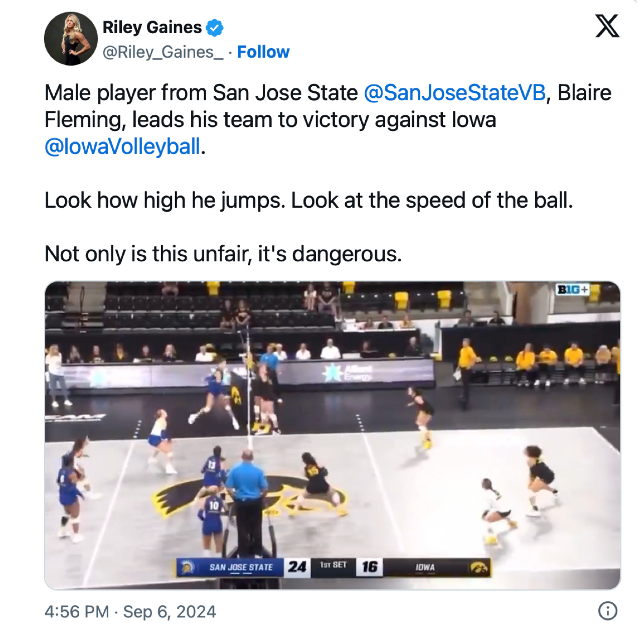 🔥 Sports news site The Spun ran a terrific story yesterday headlined, “College Volleyball Team Refusing To Play Opponent With Transgender Player.” It’s spreading!