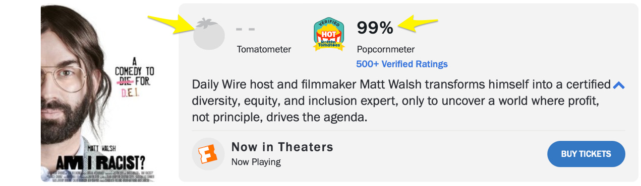 🔥🔥 Matt Walsh’s new movie Am I Racist?, closed fourth this weekend behind the Beetlejuice reboot and Deadpool number seven (or six, I lost count). It garnered a ceiling-shattering 99% viewer score on Rotten Tomatoes. But cowardly critics have refused to review Matt’s movie.