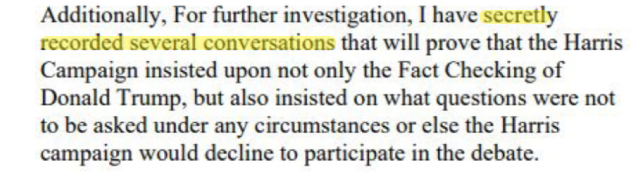 Now for the claims. The whistleblower claimed that the Harris campaign insisted on certain secret conditions, to which ABC agreed, including that: