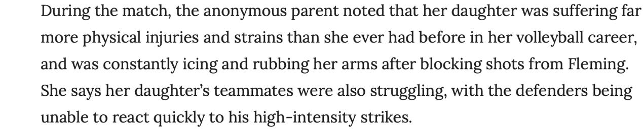 In a related Reduxx article, a parent complained her daughter sustained injuries playing against Brayden “Blaire” Fleming in a game earlier this year:
