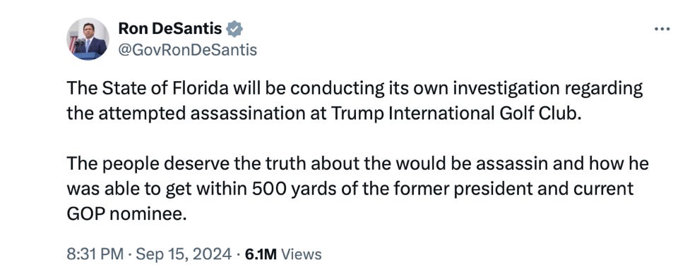 In more encouraging news, presumably thanks to the crackerjack job the FBI did covering u… I mean investigating the previous assassination attempt, best-in-class Florida Governor DeSantis announced last night that the State of Florida will conduct its own independent investigation of the shooting: