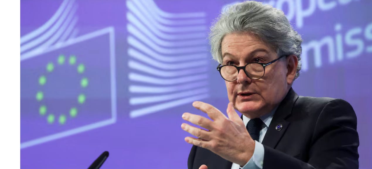 You might recall the grandmotherly-looking EU commissioner from his highly public spat with Elon Musk last month, after Thierry threatened to prosecute Musk for running his interview with Donald Trump. Musk responded with a meme that I cannot include in this family blog.