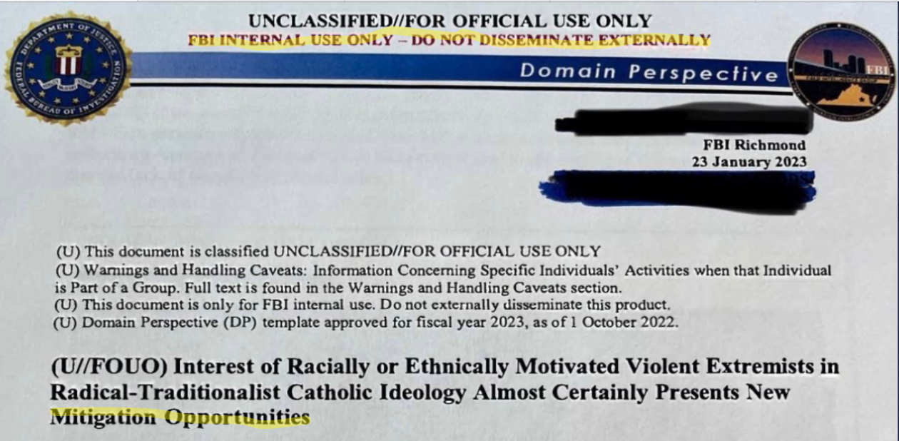 Haha, new mitigation opportunities! That means YOU. You pesky “tradcon” Catholics are the FBI’s “new mitigation opportunity.”