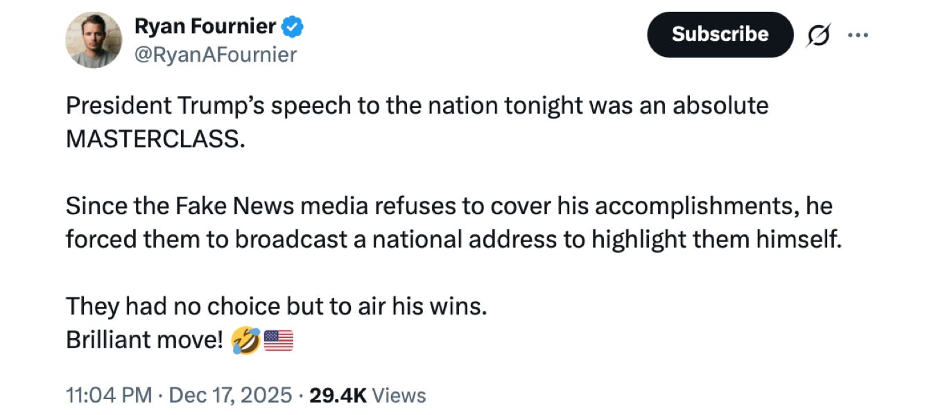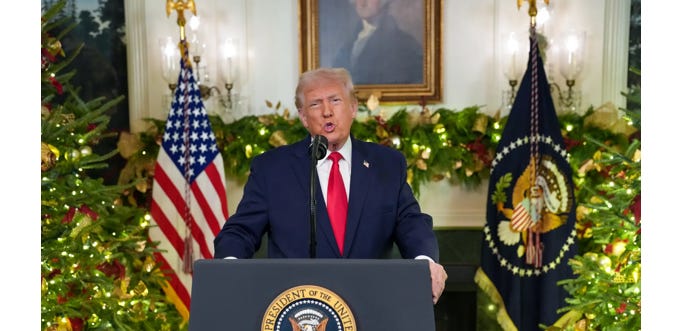 It was hard to find an issue that wasn’t mentioned. He declared no wars, and announced no new policies (except one— active U.S. servicemembers will get a $1,776 Christmas bonus from tariff revenue. That’s nice.) Rather, the speech was a mission review from his first 11 months in office, with a particular focus on prices.
