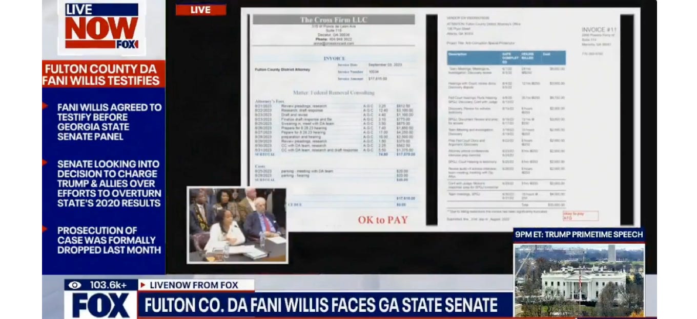 Yesterday, CBS News ran a very entertaining story headlined, “Fulton County DA Fani Willis clashes with Georgia Senate committee over Trump prosecution.” The Senators confronted Ms. Willis with bills she authorized for her personal boy toy and squeeze Nathan Wade, who invoiced 160 hours of work per week, or around 23 hours per day. (If you can imagine the things he must have been forced to do during all that time, you can eke out a little sympathy.) Anyway, Willis thoughtfully and in a very professional manner replied with a fiery, incoherent broadside arguing, if I understand it right, that Wade used to come in early at 7:45am: