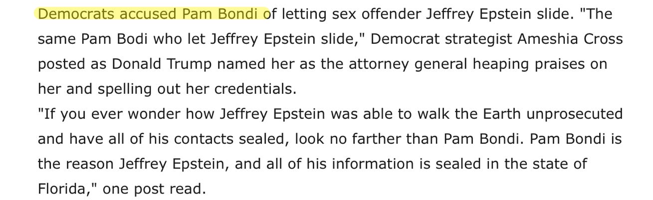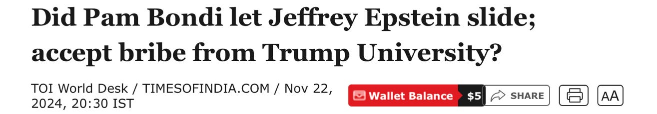 Some high-follower-count influencers dug up old allegations that “Pam let Epstein slide.” For example, this November 2024 Times of India headline made the rounds: