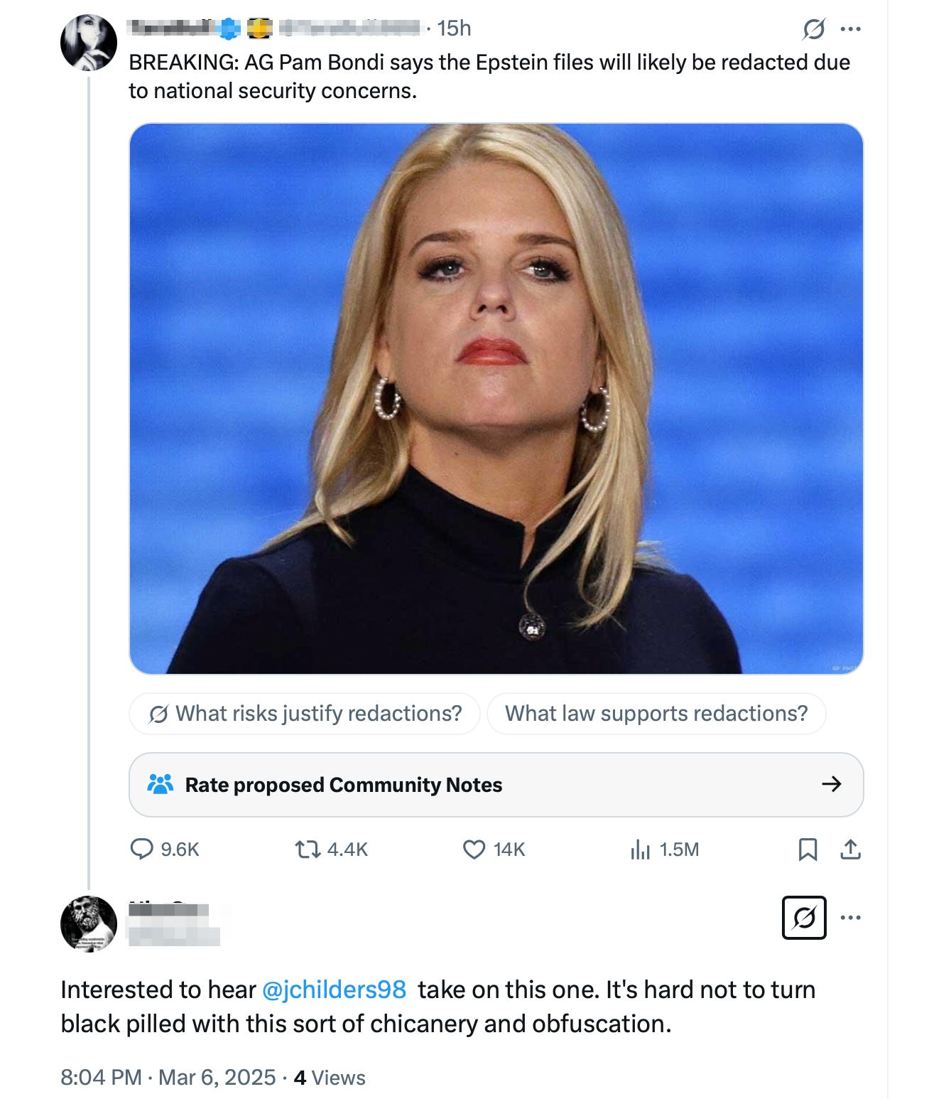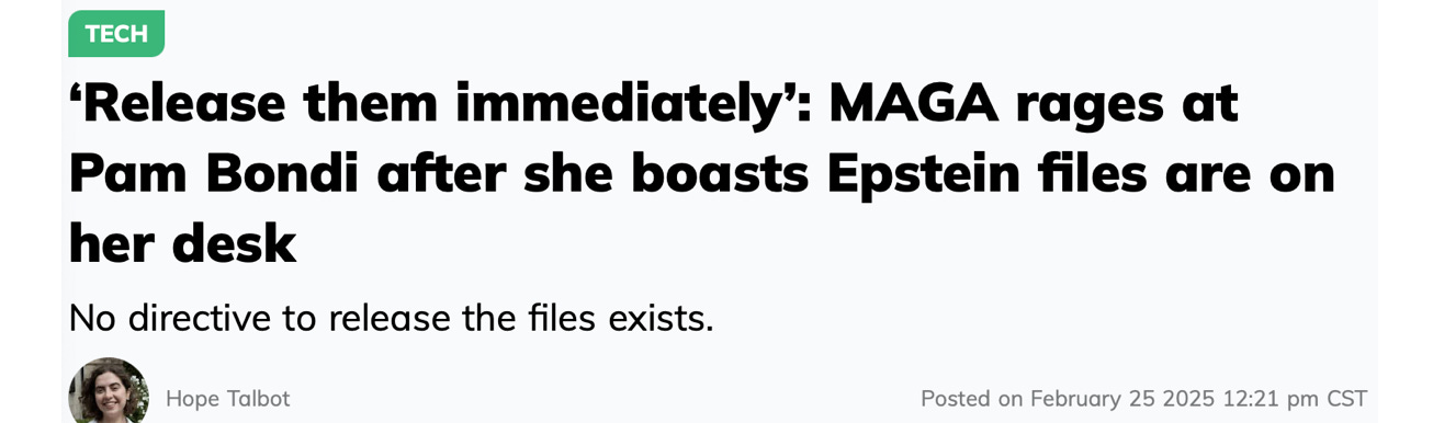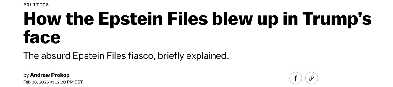 🪖 In immediate response, as though from nowhere, a huge black-pilled mob rose up to take Pam down. She’s part of the coverup! She’s on the list! She was probably in on it from the start! Progressive media, otherwise allergic to Epstein stories, suddenly discovered a fresh sense of urgency, sprang into action, and began excavating a massive pig-pile of blame. Headline, far-left Vox, February 28th: