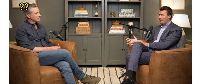 California Governor Newsom has started a new podcast! He’s obviously preparing for a presidential run in four years. But he’s also starting to learn a few poignant lessons, the hard way. Politico ran the story yesterday under the headline, “Newsom’s move on trans athletes jolts 2028 campaign.” It all went sideways during Newsom’s podcast interview with Turning Point USA’s Charlie Kirk: