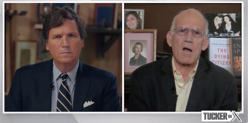 🔥 Yesterday, former Fox News correspondent Tucker Carlson posted a deadly serious interview with constitutional scholar Victor Davis Hanson, and sparks flew. If you tend to get anxious when hearing serious people talk about how deep we all are in the tomato soup, then you might want to skip the video clip, which is on the long side anyway. If so, don’t worry, I have some comments below to give you the gist.