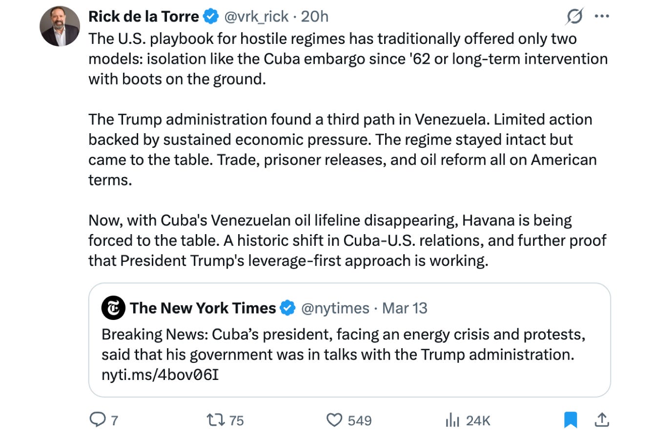 Cuban fuel stopped flowing in January, when Trump’s Executive Order 14380 cut off the Venezuelan oil pipeline— following the Trump administration’s involuntary relocation of Venezuelan President Nicolás Maduro, which the Guardian finds sinister and which sane people find extremely satisfying. The regime’s official response to eight nights of national blackouts and a fuel-starved island was to dispatch dry rice and extra milk rations to the protest areas as a containment measure.