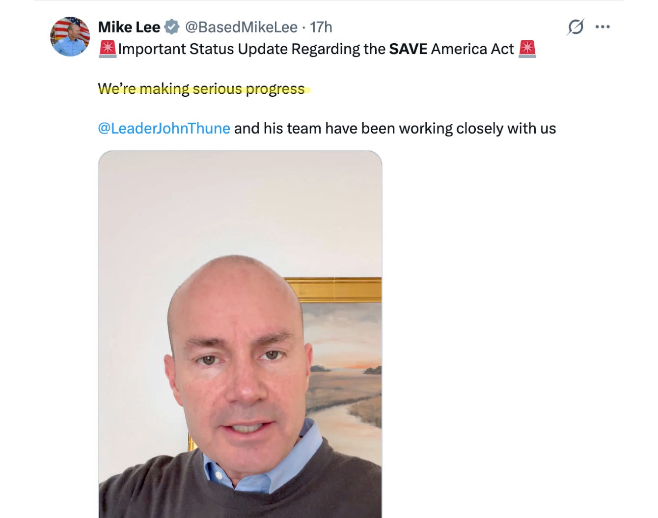 CLIP: Senator Mike Lee announces serious progress on SAVE Act debate (1:11).