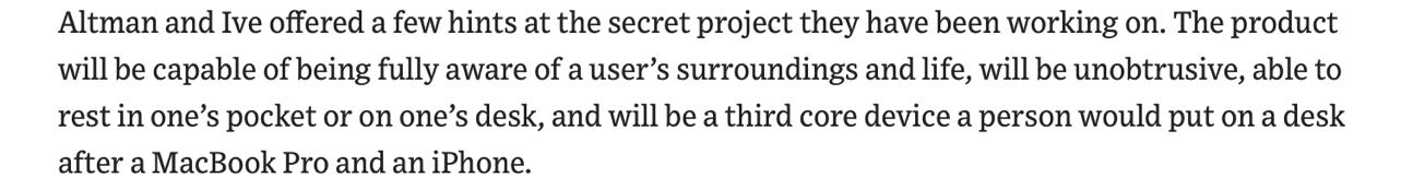 When I watched yesterday’s glowing love-fest between the two men, I first thought Altman was hinting at an always-on, wearable AI device that would know everything that happens in your life and can serve as a constant advisor or consigliere. He’d complained about having to explain to AI what you wanted, having to pull your phone out to access the chatbot, and wanting something without a screen.