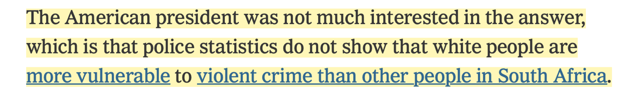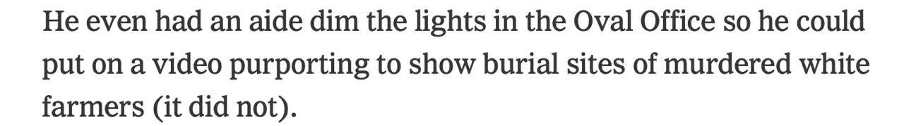 The problems have been growing for months. The Times seemed most offended about a recent official visit from white Afrikaner lobbyists, since the White House’s media briefing called them “civil rights leaders.” How dare they. Another widely covered story last week reported about how, after suspending all other refugee claims, DHS admitted dozens of white South African families to the US as political refugees, which appeared to officially endorse the “genocide” agenda.