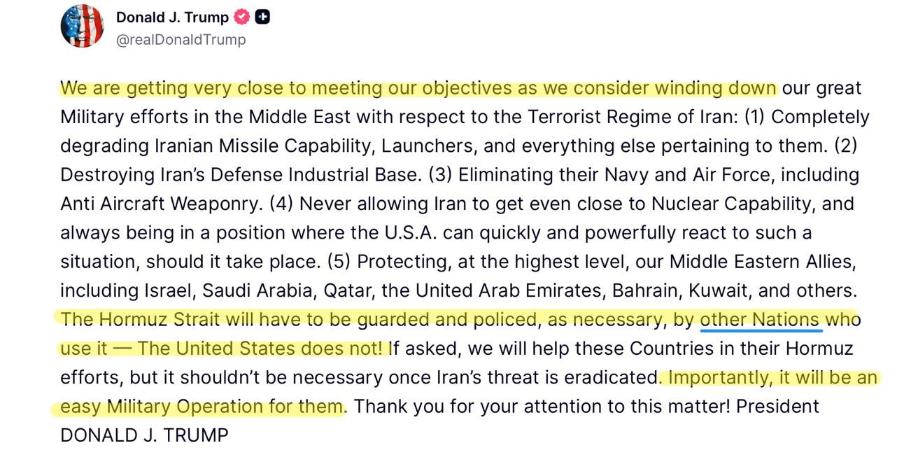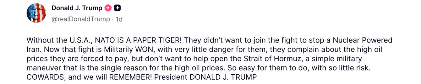 This is the context for Trump’s sarcastic Truth Social post. “The Hormuz Strait will have to be guarded and policed by other Nations who use it.” He knows they can’t do it. They know they can’t do it. The post isn’t a policy proposal. It’s a mirror— and what NATO sees reflected in the mirror is thirty years of defense freeloading, energy dependency, and strategic complacency staring back at them.