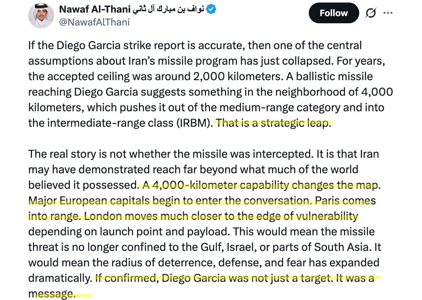 Yesterday, Iran’s Diego Garcia launch just proved the Europeans are within missile range of a regime they can’t deter. And now, with Europe broke, disarmed, energy-starved, ammunition-depleted, and staring at an Iranian missile envelope that covers London and Paris— now Trump tweets that maybe they should handle the Strait themselves. It should be simple!