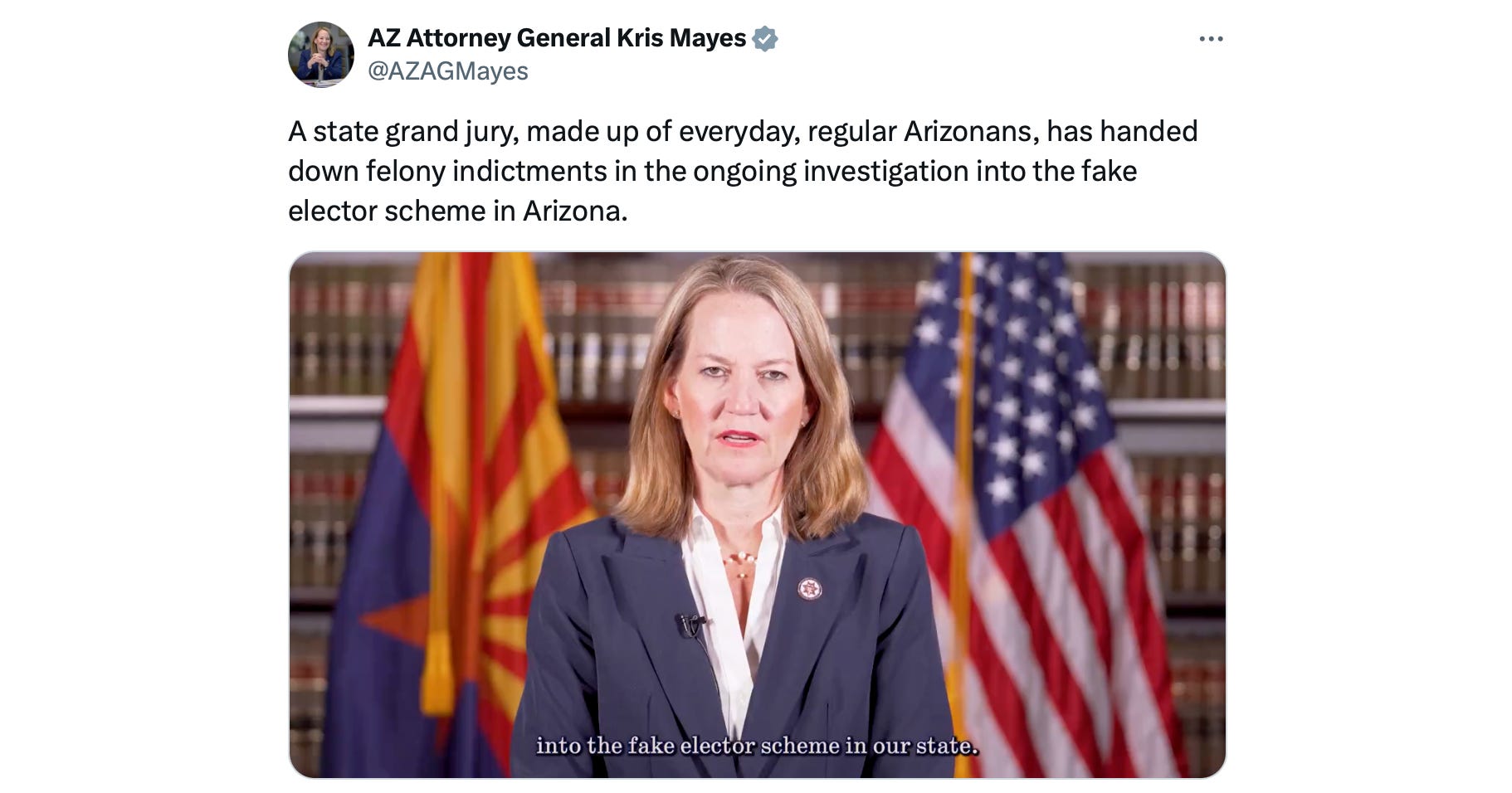 As if the Michigan, Georgia, and Nevada prosecutions weren’t already enough, yesterday Arizona Attorney General Kris Mayes (D) indicted seven attorneys and aides who worked on Donald Trump’s 2020 presidential campaign, plus 11 local Arizona Republicans on felony charges for fraud and forgery (and conspiring to do those things).