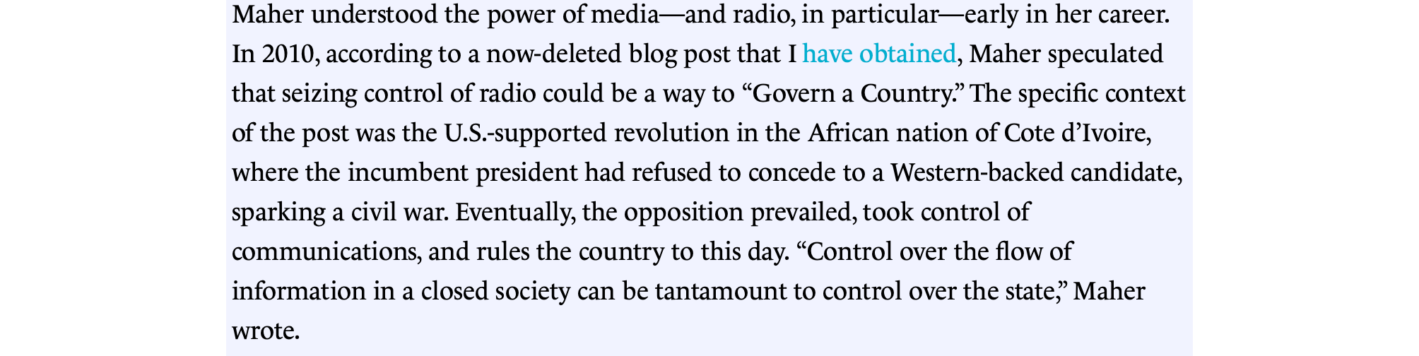 One possibly for what she’s doing at NPR might be described in one of her now-deleted blog posts from 2010, in which a very young and very idealistic Katie Maher mused about the role of media in terms of political control. In the scrubbed article, she described how gaining control of African media — in that case, radio — could ultimately provide “control over the state.”