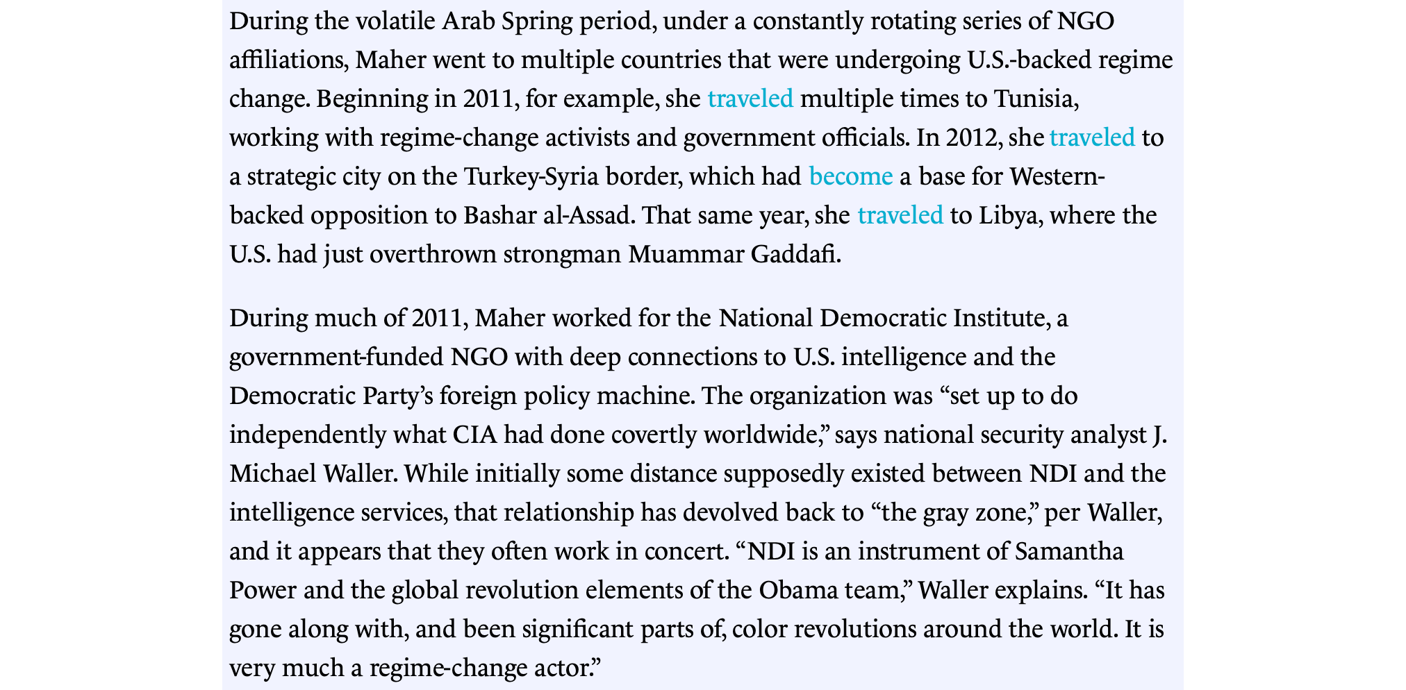 It now looks like Katherine Maher is nothing less than a deep state regime-toppling tool on the order of regime-change-queen Victoria Nuland, except younger and under deeper cover. Here’s part of how Rufo described what his research uncovered, which was a pretty bizarre resume for the CEO of what should be a public news agency. Maher’s career involved world travel while working for political nonprofits, and she managed to hit all the color-revolutionary hotspots like they were nightclubs along a bar-crawling gal’s trip: