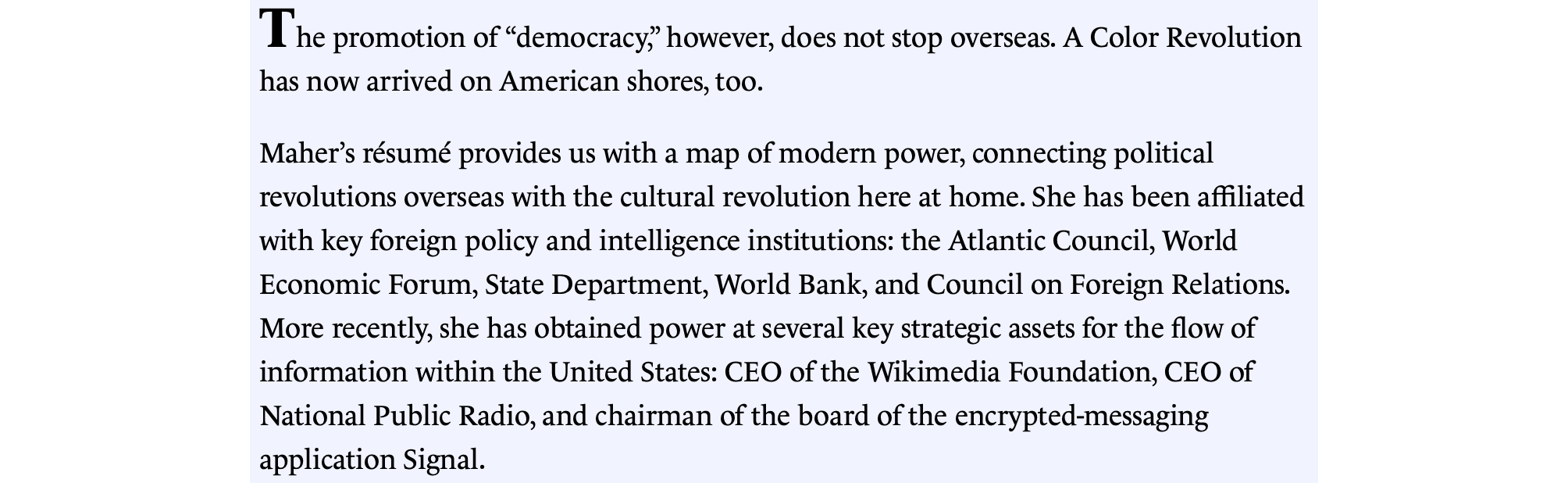 🔥🔥 Which brings us to Chris Rufo’s latest article, published in City Journal yesterday under the headline “Katherine Maher’s Color Revolution.” The sub-headline added, “The NPR boss is a symbol of regime change—foreign and domestic.” Ms. Maher is in her late thirties and childless. Not that there’s anything wrong with that. The problem here is much worse.