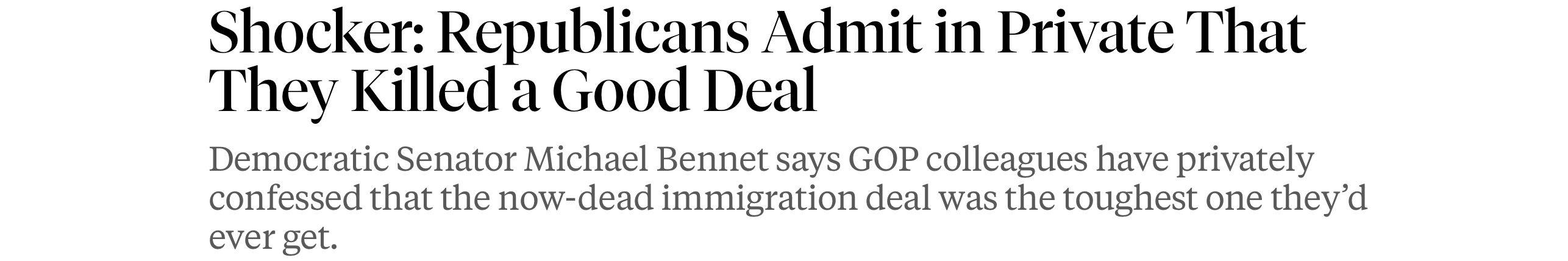 I won’t bother responding to that, it’s a very silly, unsourced story. Every Republican knew the bill was terrible, because it was terrible. Because Republicans were trying to reach any kind of agreement in the Senate on any kind of border bill, they didn’t particularly care what was in it, chicken or beef or even tofu (gag), since they planned to stop it in the House anyway. But Democrats caught on and flipped the script and now nobody gets a burrito.
