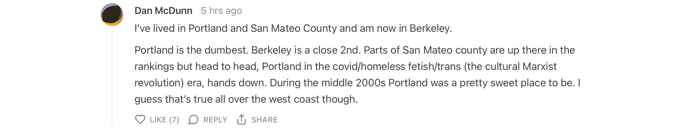 One commenter who lived in all three places even ranked San Mateo third dumbest, behind Portland (number one) and Berkeley, California:
