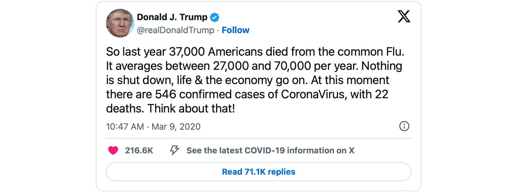 February 4th is crazy early. Trump — the President of the United States and allegedly the commander of the armed forces including the Department of Defense — continued comparing Covid to the flu through March 9th — over a month later: