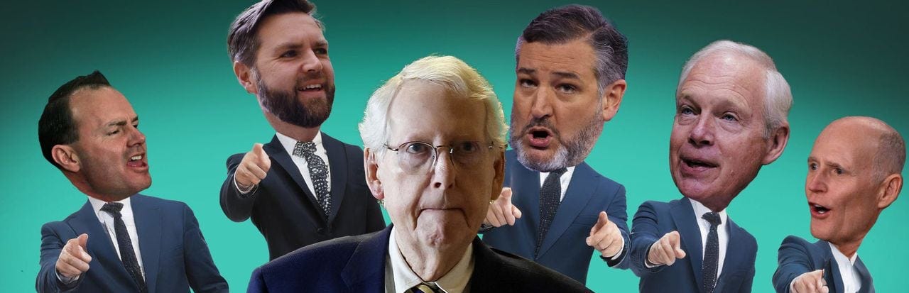 Unfortunately, it turned out that the border burrito blew up in the Senatorial microwave making an unholy mess that Republicans are going to have to clean up. Plus they all now have Montezuma’s Revenge. This can’t possibly have been the original plan, which was probably to pass any bill and let the House Republicans kill it. I conclude that because the Republicans are in disarray and now the long knives are out for Mitch, as reported by the Daily Caller yesterday in its article headlined, “EXCLUSIVE: ‘This Is Our Opportunity’ — Top GOP Senators Game McConnell’s Ouster After Botched Border Deal.”