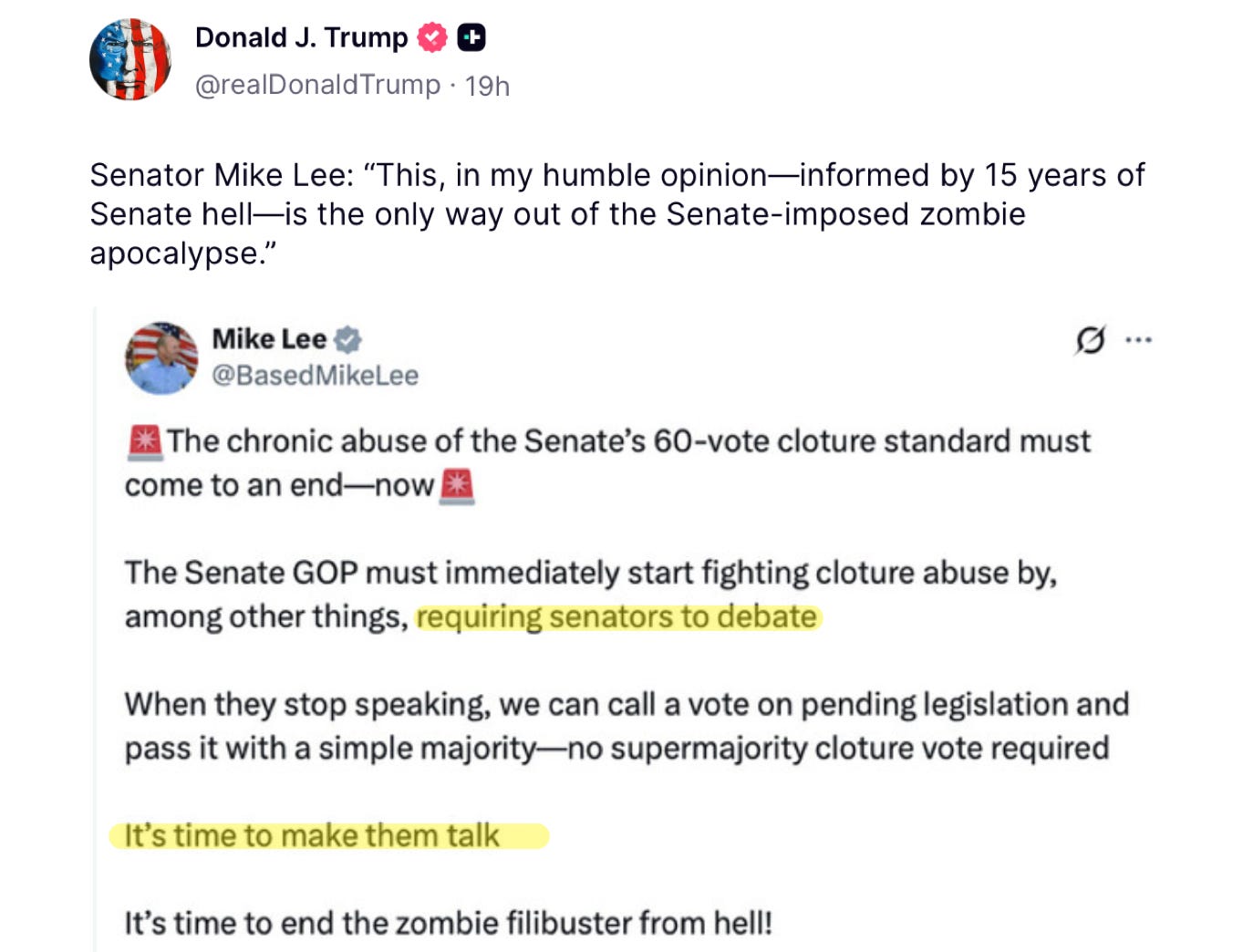 It may soon be the Night of the Dying Filibuster. Yesterday, President Trump reposted Senator Mike Lee’s (R-Ut.) shambolic suggestion to end the silent filibuster —which he calls the ‘zombie filibuster from hell’— by requiring debate, which is what we’ve been saying for months now. In other words, we’re making slow progress toward burying the silent filibuster for good.
