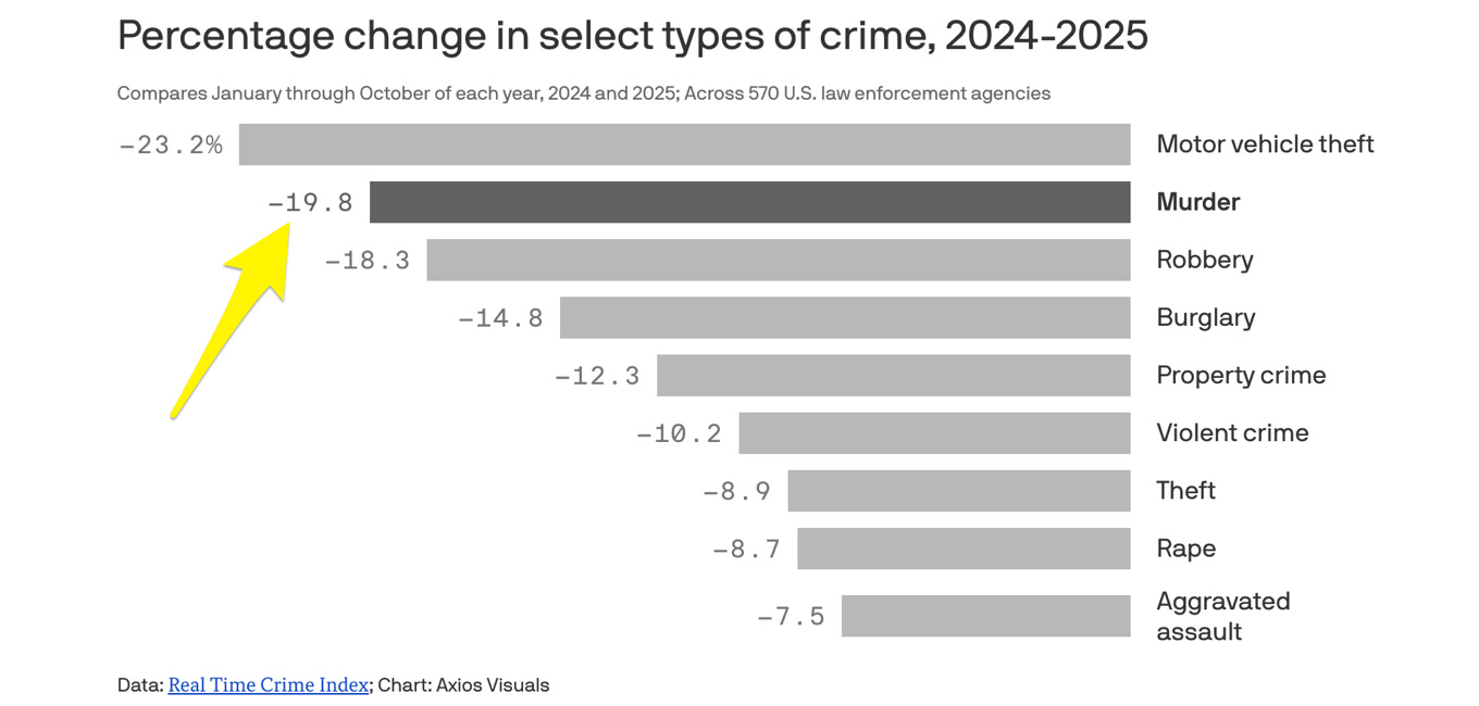 Whether you will credit President Trump’s all-of-government crime crackdown —including massive immigration enforcement— the trend remains great news. And rates continue improving. Not that Axios will do more than notice the happy accident. It did, however, admit that murders in Washington, DC, where Trump has focused on crime, are down a historic -28%. So.