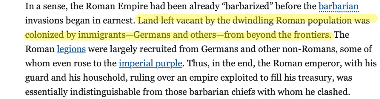According to Brittanica.com, the causes of the Roman Empire’s fallwere remarkably similar in many ways to our own times, particularly regarding the key facts of a dwindling native population combined with an invasion of barbaric immigrants, what you might call iron mixed with miry clay: