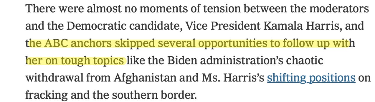 Kamala also said some totally forgettable stuff, not one sentence making a headline or going viral, for two reasons. First, the patently partisan moderators failed to ask Harris anything that anybody would want to know, like why she flip-flopped about some of the race’s most important issues. Even the New York Times was forced to admit the laughing candidate got lame questions and zero fact-checking that produced a boring slog: