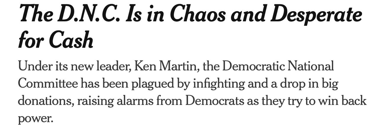 A drop in big donations? Or is it rather just, a big drop in donations? Either way, it’s bad. The Times was forced to report, “the Democratic National Committee’s financial situation has grown so bleak that top officials have discussed whether they might need to borrow money this year to keep paying the bills.”