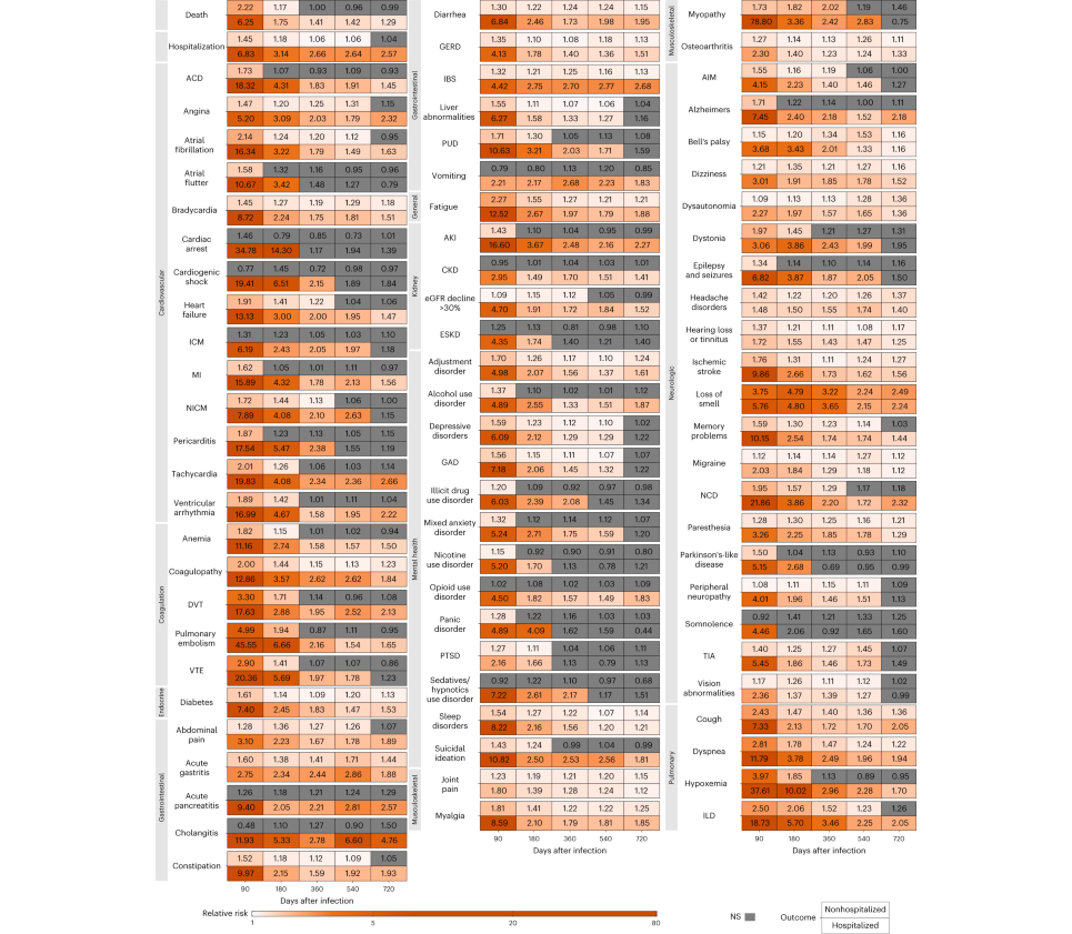 It wasn’t just death; that’s just what the Mirror focused on. The researchers allegedly found a higher risk for most (60%) of a very long list of problems they called “postacute sequelae.” It's such an impressively-gigantic list that I though it would be easier to just show you the study’s chart: