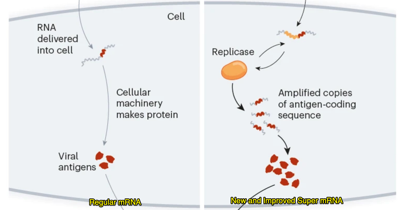 Self-replication is an “improvement,” since ‘regular’ mRNA is (supposedly) one-and-done: