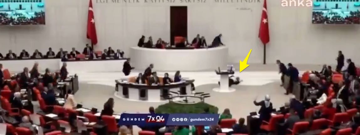 CLIP: Turkish Minister of Parliament dramatically collapses in mid-speech (0:14).