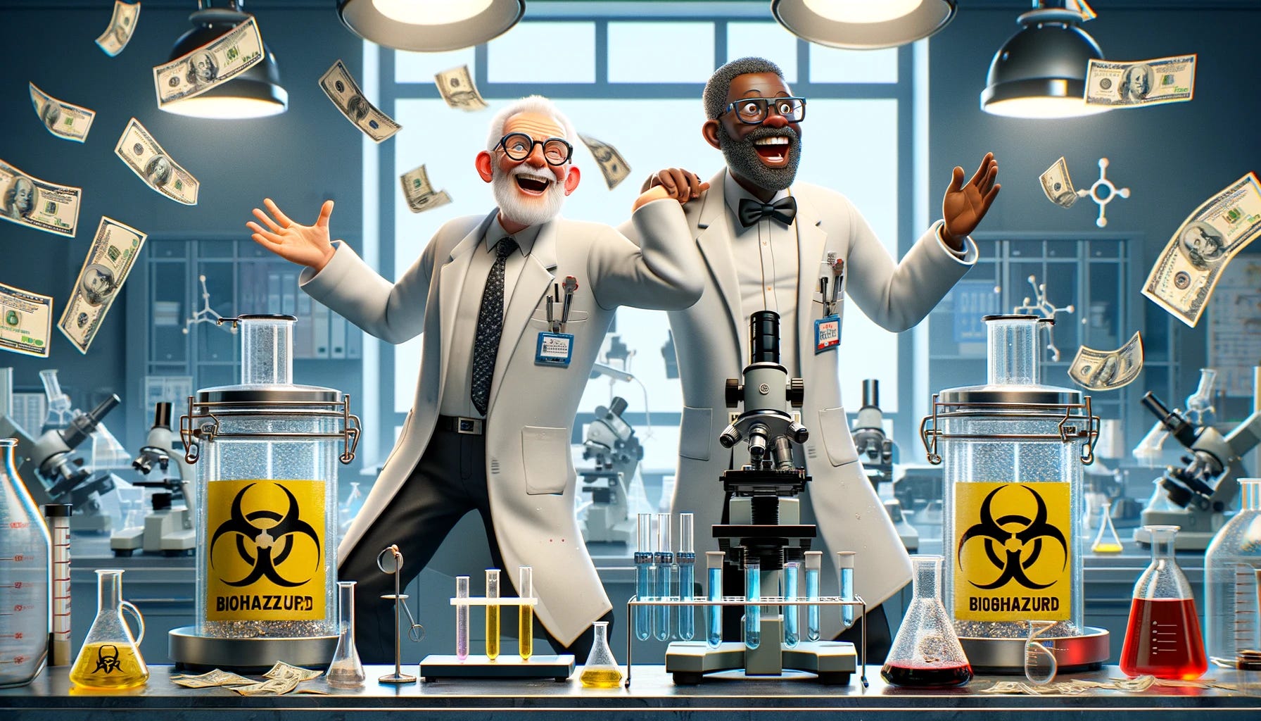 (The two scientists then link arms and begin tap dancing, singing along to a sped-up rendition of “Roll Out the Barrel” while dollar bills rain down on them from the ceiling. And, scene.)